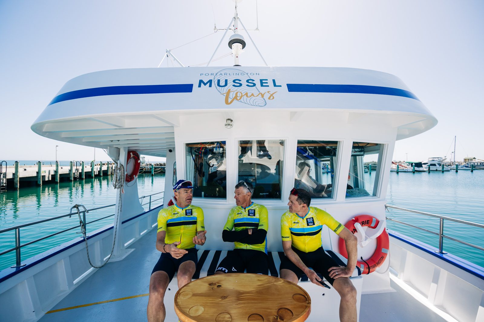 Cadel was emphatic during our pre-Big Ride route planning: we simply have to visit Portarlington Mussel Tours to say g’day to the cycling-mad business owners Lance and Lizzie Wiffen. Within minutes of arrival, we’re convinced (with little resistance) to climb aboard their 40-year-old Huon Pine vessel Valerie, and putter 3km out to their mussel farm.