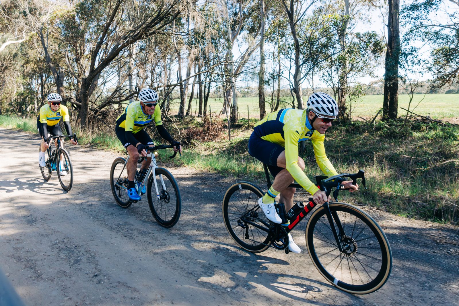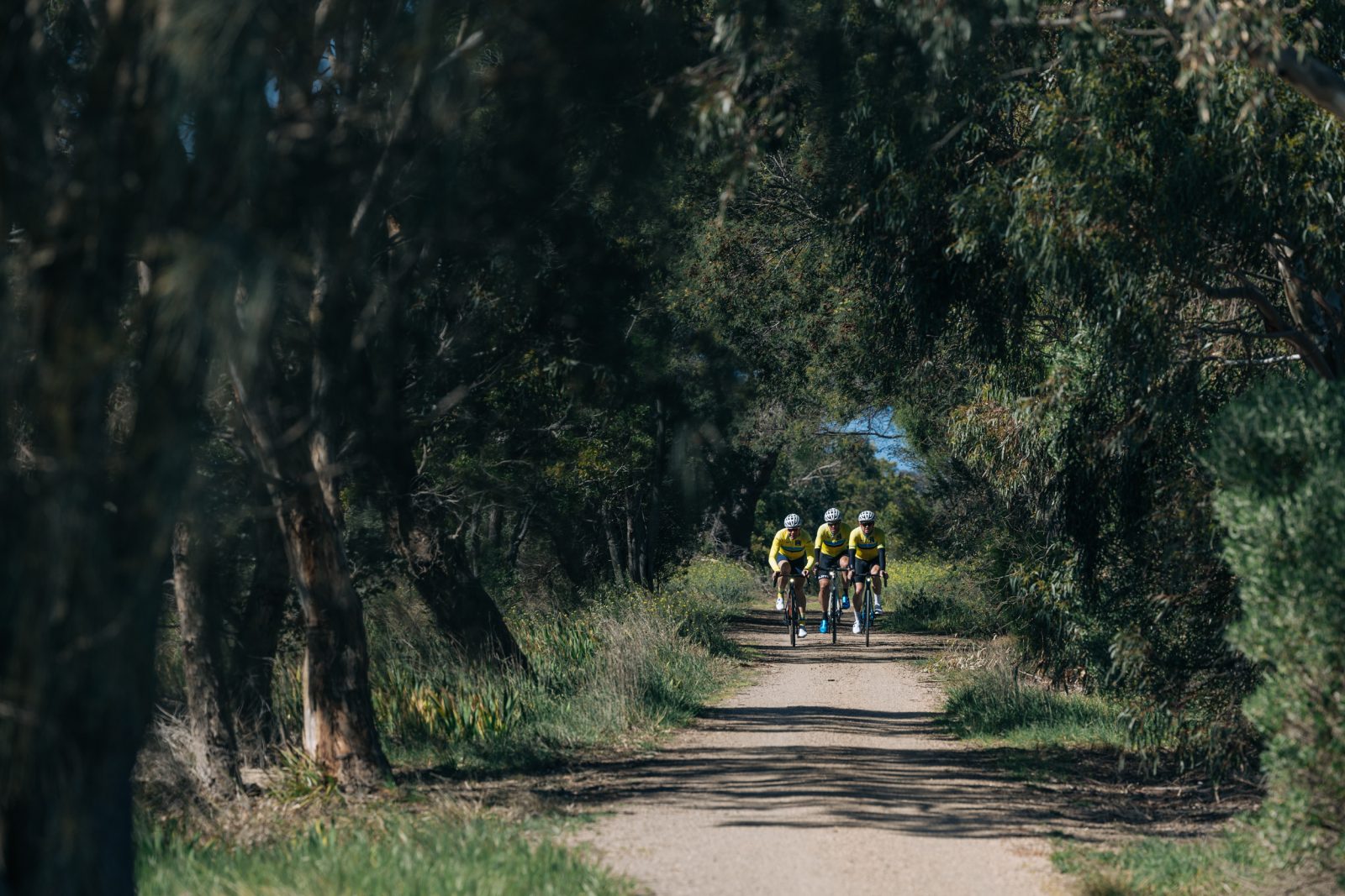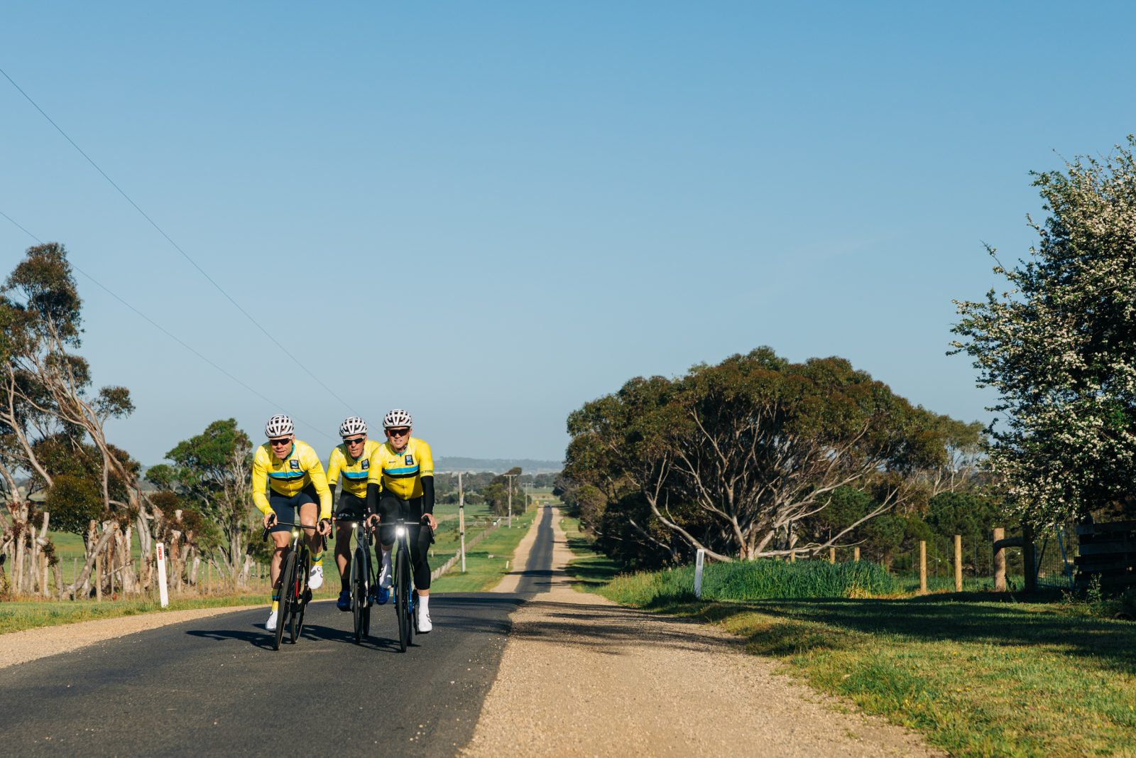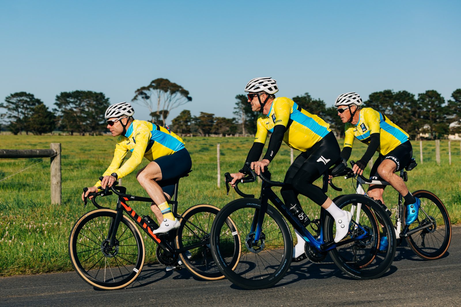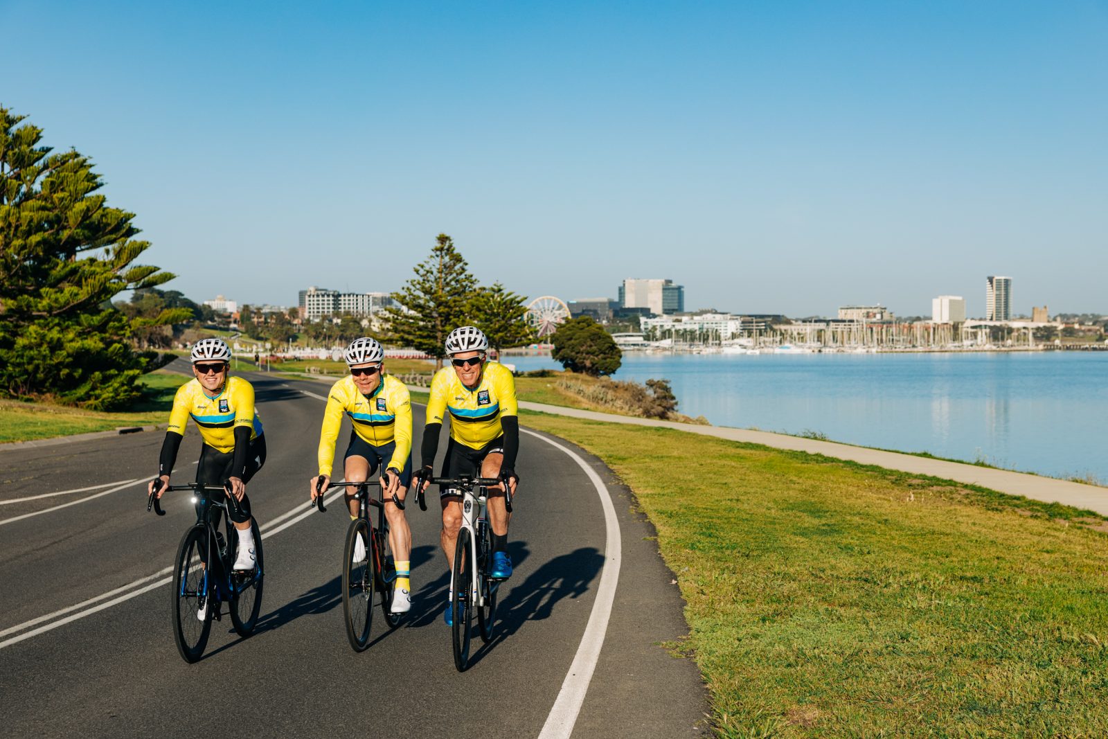 he morning light spills over the Geelong waterfront, and three figures roll quietly into view. Between them, they’ve worn yellow jerseys, conquered Europe’s peaks, and defined