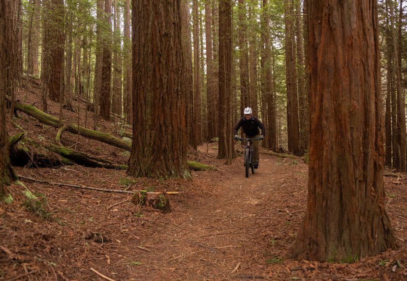 Cory and I zip through this section, a perfect warm-up for the day’s ride. Eventually, the route reconnects with the Forest Loop proper, its entrance nestled beneath a majestic plantation of Californian redwoods and pines. Planted over a century ago, these towering giants have become synonymous with Rotorua’s trail network. The grove feels almost otherworldly, with filtered light streaming through the high canopy and casting dappled shadows over the trail. It’s a unique environment: the redwoods aren’t native to New Zealand but thrive here in the volcanic soil, reaching heights comparable to their Californian cousins and providing an incredible backdrop to the ride. With the overhead light largely blocked, the forest floor is surprisingly open and clear of undergrowth, a wild contrast to the Australian gravel I’m used to.